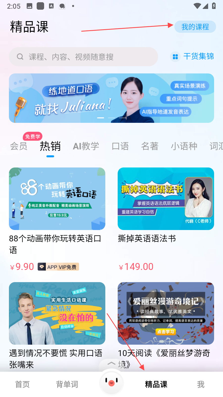 1、點擊底部導(dǎo)航欄中的精品課,進入精品課頁面,在該頁面中,點擊右上角我的課程,可查看已購買或加入學(xué)習(xí)的課程內(nèi)容。