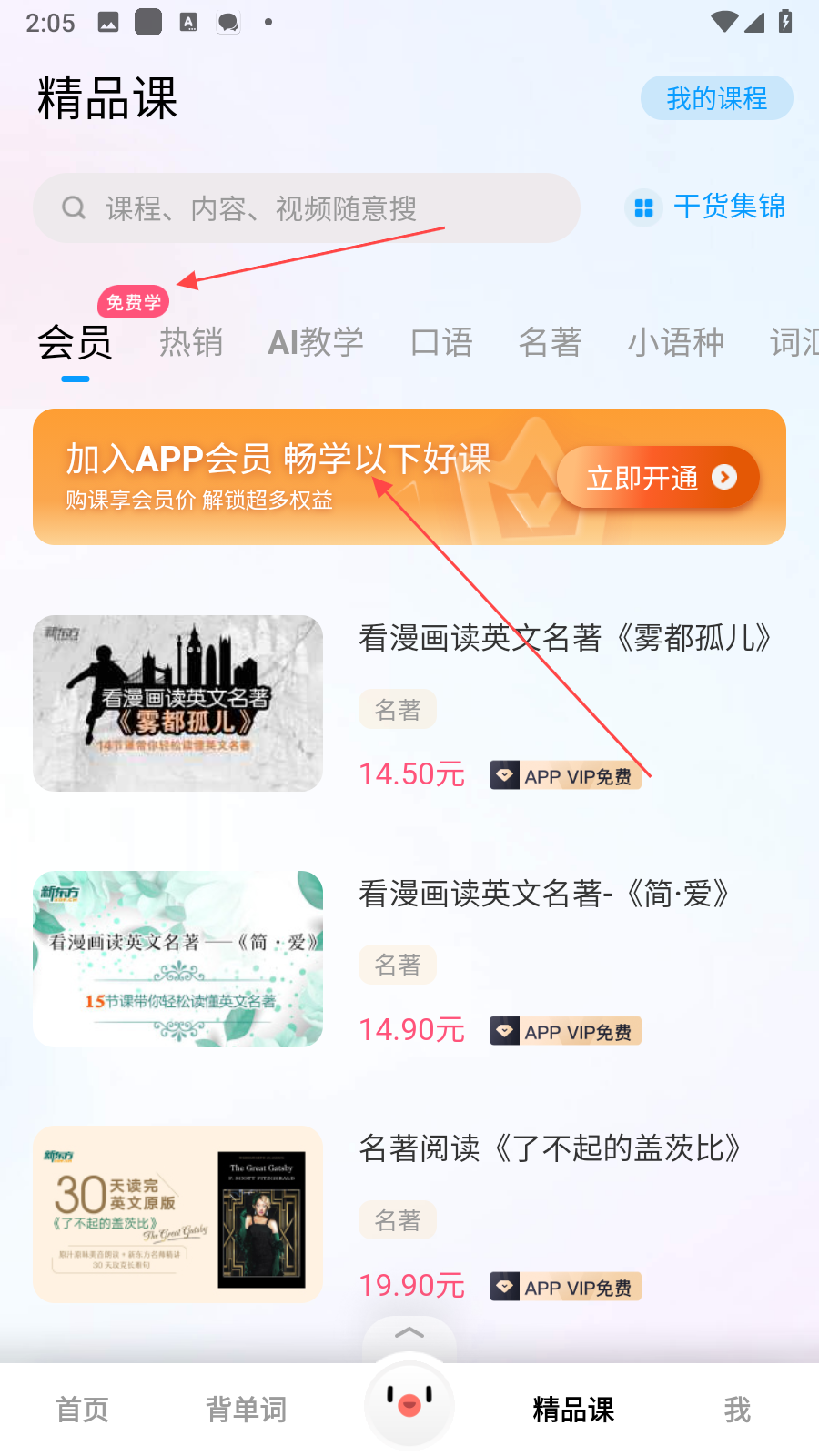 2、在精品課頁面的搜索欄,可輸入關(guān)鍵詞搜索想要學(xué)習(xí)的課程,頁面設(shè)有會員、熱銷、AI教學(xué)等分類標簽,點擊標簽篩選課程,還能點擊加入APP會員了解會員權(quán)益。