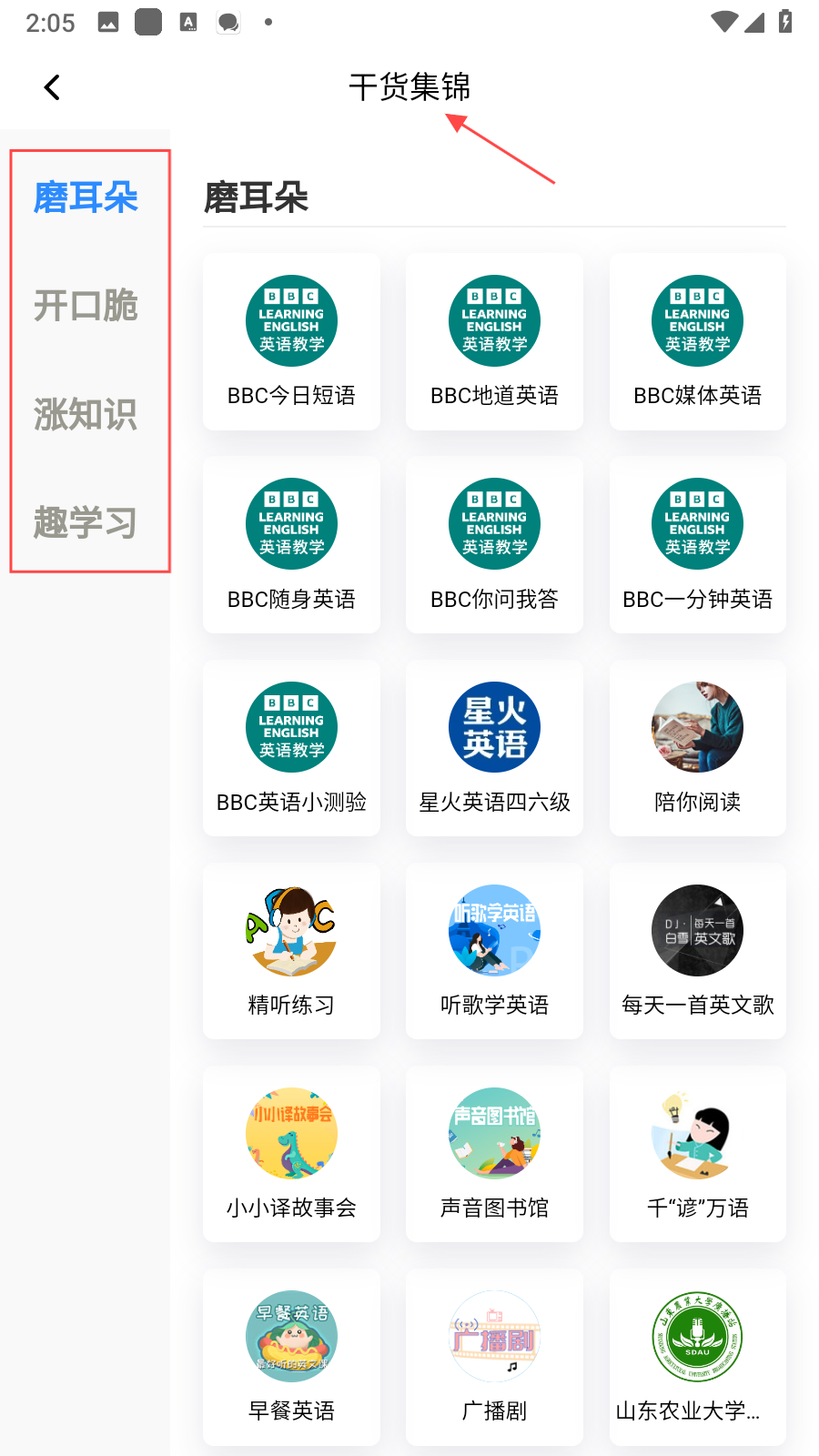 3、點擊精品課頁面右上角的干貨集錦,進入干貨學(xué)習(xí)界面,左側(cè)有磨耳朵、開口脆、漲知識、趣學(xué)習(xí)等分類,點擊分類查看對應(yīng)學(xué)習(xí)資源,像BBC英語教學(xué)、聽歌學(xué)英語等內(nèi)容。