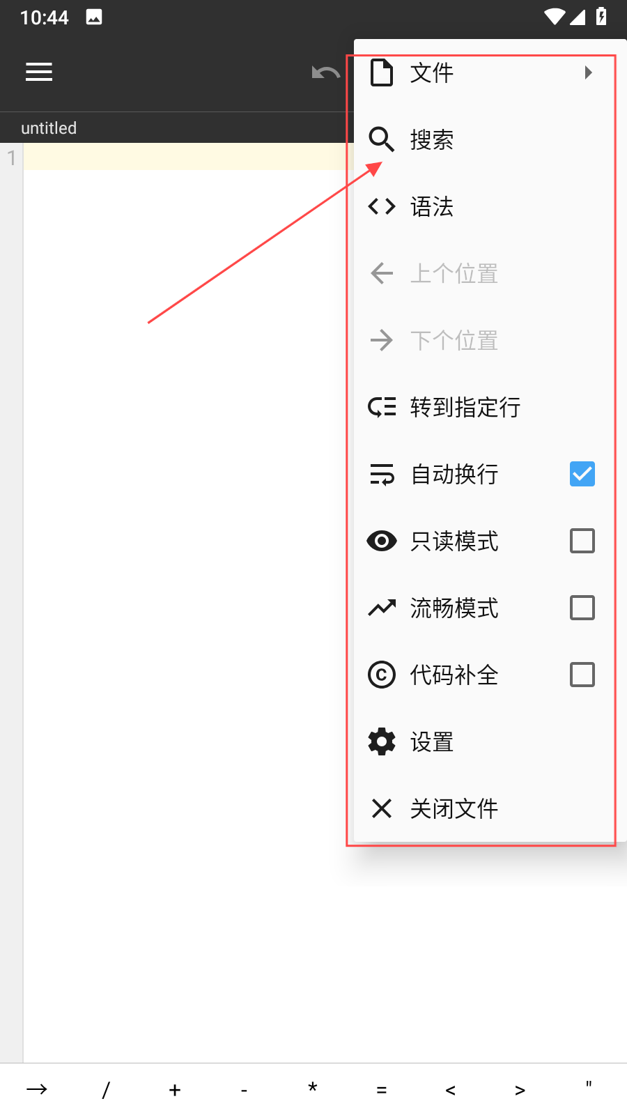3、點(diǎn)擊右上角的三點(diǎn)圖標(biāo)可打開更多功能菜單,在這里能進(jìn)行文件操作、內(nèi)容搜索、語法設(shè)置、自動(dòng)換行設(shè)置等操作,完成文本編輯后,點(diǎn)擊保存相關(guān)選項(xiàng)即可保存編輯好的文本。