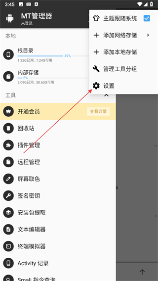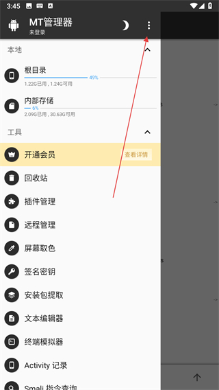 1、打開MT管理器應(yīng)用,點(diǎn)擊左上角菜單按鈕展開側(cè)邊欄,在側(cè)邊欄的工具板塊中點(diǎn)擊文本編輯器進(jìn)入編輯界面。