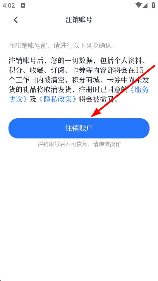 4、在注銷說明的頁面,點擊注銷賬戶按鈕,完成賬號注銷操作。