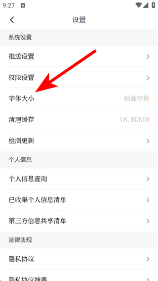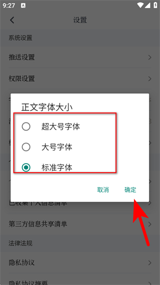 3、在設(shè)置界面,點擊字體大小,彈出正文字體大小選擇框。