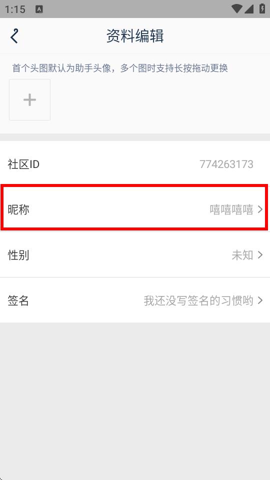 3、進(jìn)入資料編輯頁(yè)面后,點(diǎn)擊昵稱選項(xiàng)。