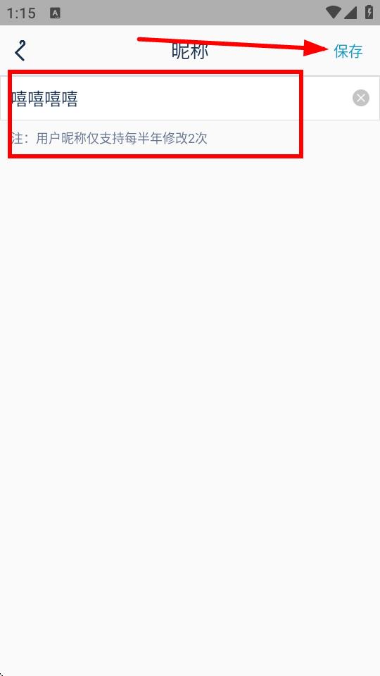 4、在昵稱編輯框中輸入想要修改的昵稱,確認(rèn)無(wú)誤后點(diǎn)擊右上角的保存即可完成昵稱修改。
