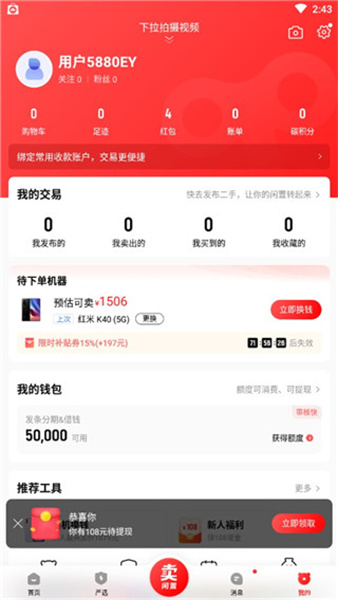 4.登陸賬號,點擊我的,可以查看交易記錄、自己的瀏覽足跡、發(fā)布的信息、賣出的收入等等各種需要查看的有用信息都在這里。