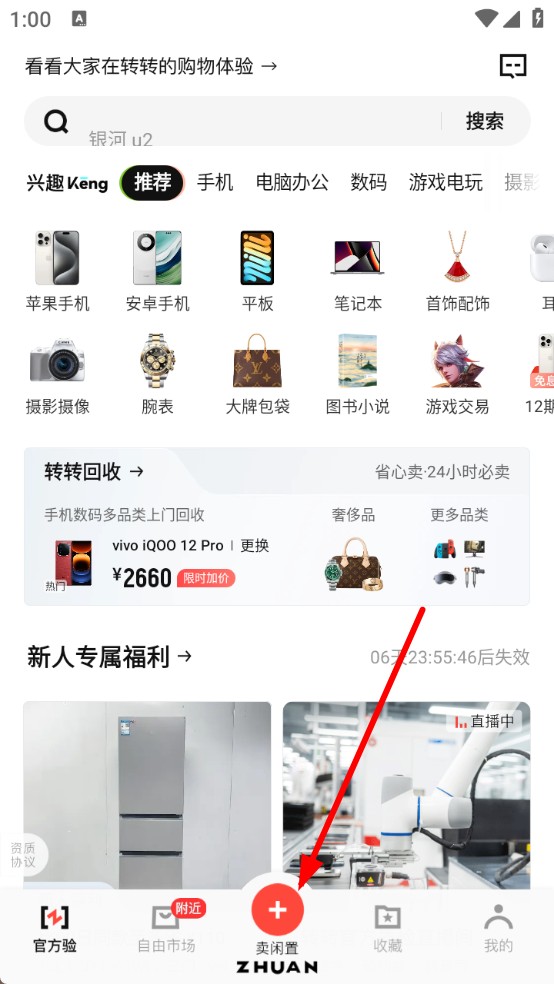 1、打開轉轉APP,在底部導航欄中點擊正中間的賣閑置圖標。