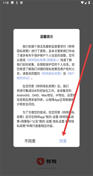 1、在打開轉轉app后,通過點擊彈窗中的同意按鈕,進入使用。