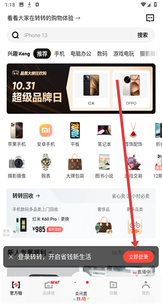 1.首先我們通過本站下載安裝好轉轉APP后,點擊屏幕下方的產(chǎn)品,就會看見其他網(wǎng)友發(fā)布的一些產(chǎn)品,屏幕上方有很多手機、筆記本、手表等詳細的分類,大家可以根據(jù)自己的需求去選擇;