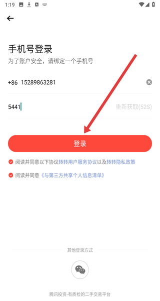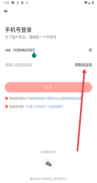 3、在進入到手機號登錄頁面后,點擊輸入框填寫手機號點擊獲取驗證碼按鈕。