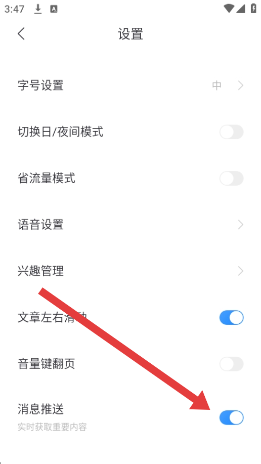 2、在設(shè)置的頁(yè)面中,找到消息推送開(kāi)關(guān),默認(rèn)是開(kāi)啟的狀態(tài),點(diǎn)擊該開(kāi)關(guān)將其關(guān)閉。