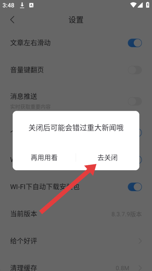 3、關(guān)閉時(shí)會(huì)彈出提示框,點(diǎn)擊去關(guān)閉的確認(rèn)操作,即可成功關(guān)閉消息推送,避免接收推送通知。