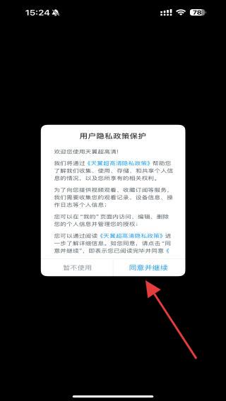 1、打開天翼視訊APP,進(jìn)入時(shí)會彈出用戶隱私政策保護(hù),點(diǎn)擊同意并繼續(xù)的按鈕。