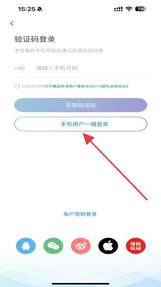 4、進(jìn)入驗(yàn)證碼登錄的頁面內(nèi),點(diǎn)擊手機(jī)用戶一鍵登錄即可。