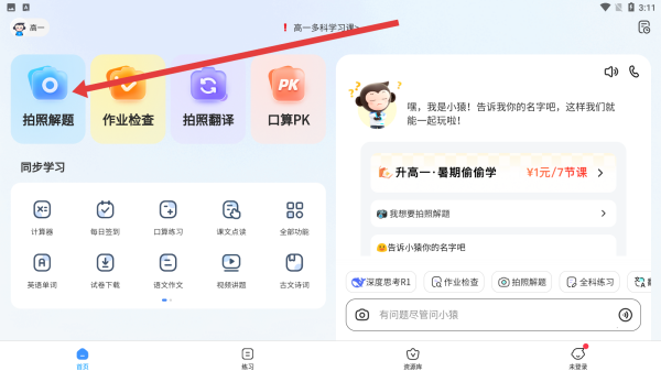 1、在APP首頁(yè)點(diǎn)擊拍照解題圖標(biāo),進(jìn)入相機(jī)權(quán)限申請(qǐng)環(huán)節(jié),開(kāi)啟借助該功能解決學(xué)習(xí)難題的流程,邁出拍照解題第一步。