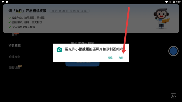 2、當(dāng)彈出相機(jī)權(quán)限申請(qǐng)彈窗時(shí),點(diǎn)擊允許,授予小猿搜題拍攝及錄視頻權(quán)限,為拍照解題功能啟用完成權(quán)限準(zhǔn)備。