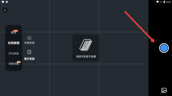 3、進(jìn)入拍照解題界面,將手機(jī)放平對(duì)準(zhǔn)題目,點(diǎn)擊右側(cè)藍(lán)色拍攝按鈕啟動(dòng)拍攝,借助功能獲取題目解答思路或答案。