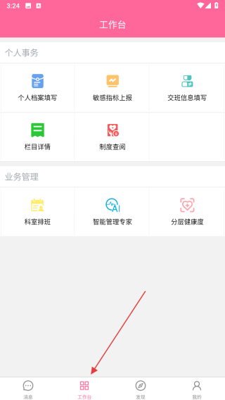 1、打開護理助手APP,進入工作臺頁面,可處理個人事務,如個人檔案填寫、敏感指標上報等,也能進行業(yè)務管理,像科室排班等,開啟護理工作流程。