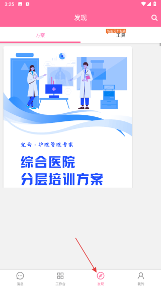 2、切換至發(fā)現(xiàn)頁面,瀏覽綜合醫(yī)院分層培訓方案等內(nèi)容,了解護理管理專家提供的方案工具,獲取專業(yè)知識與培訓資源,助力護理技能提升。