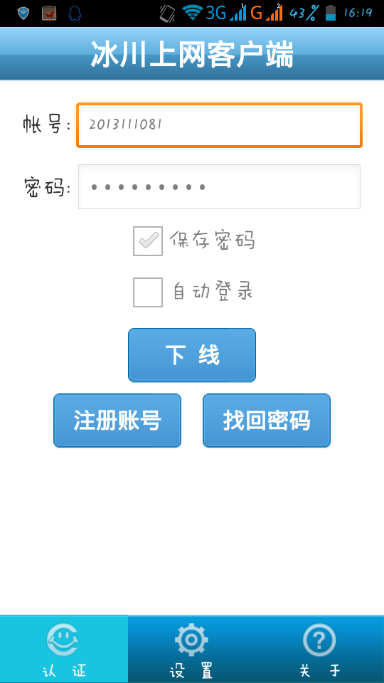 3.連上之后。打開手機(jī)上的冰川客戶端輸入自己的學(xué)號和上網(wǎng)密碼,登陸即可。