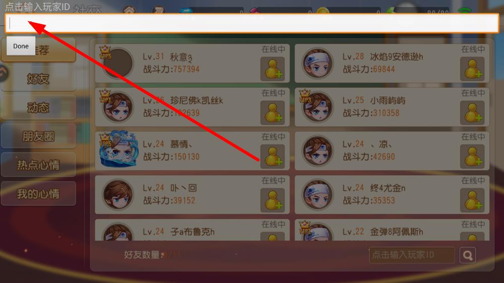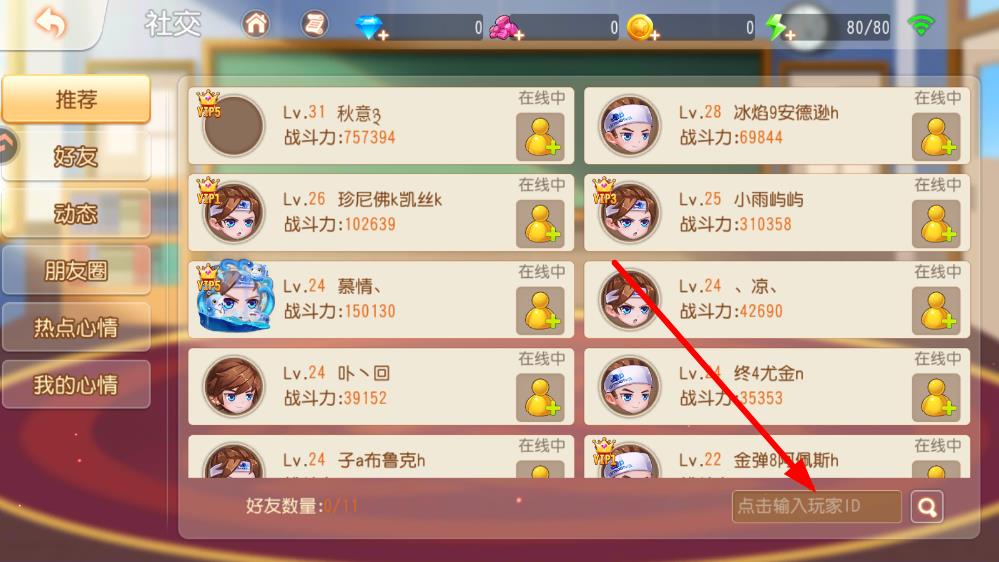 3、在社交界面中,點(diǎn)擊下方點(diǎn)擊輸入玩家ID輸入框。