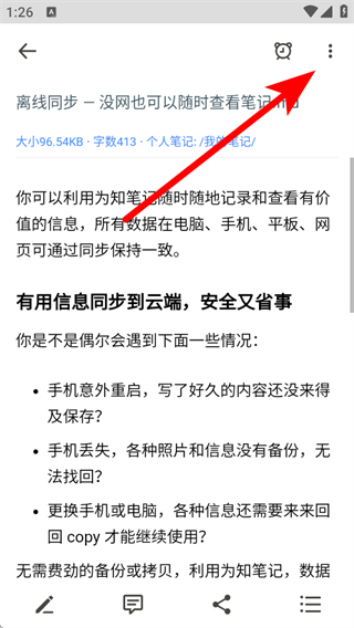 2、在筆記詳情頁面,點擊右上角的三個點圖標(biāo),展開功能菜單。