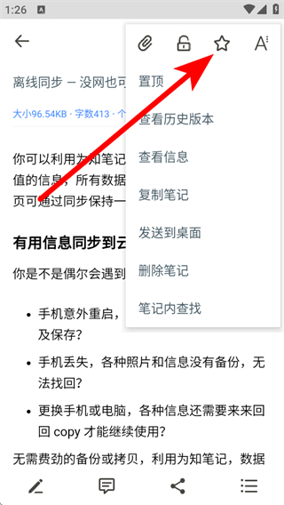 3、在功能菜單中,點擊星星形狀收藏圖標(biāo),即可完成筆記的收藏操作。