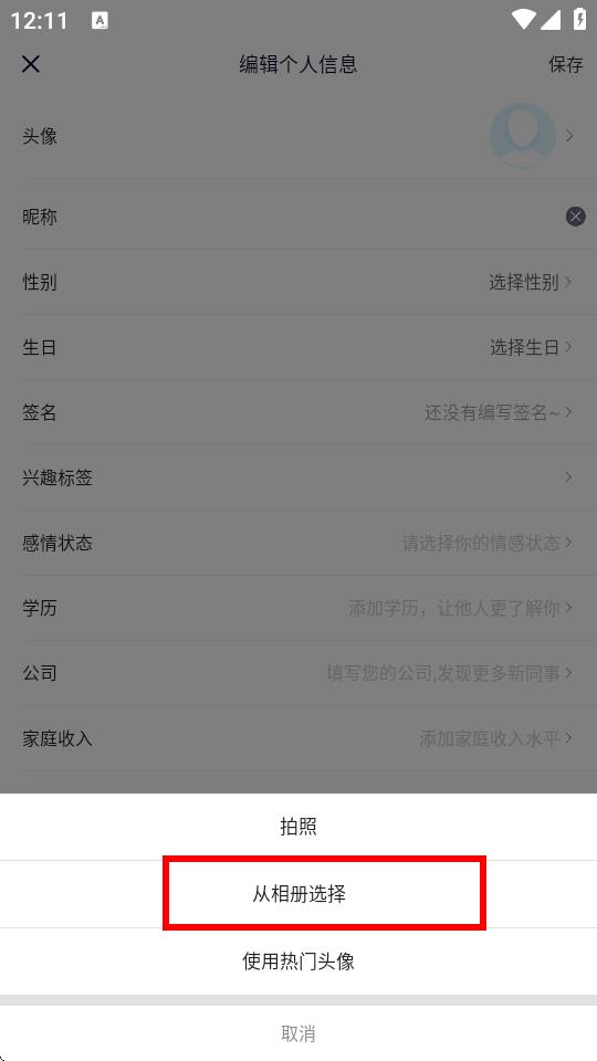 4、在彈出的選項中,點擊從相冊選擇,然后從手機相冊里選取想要設(shè)置為頭像的圖片,完成頭像修改。