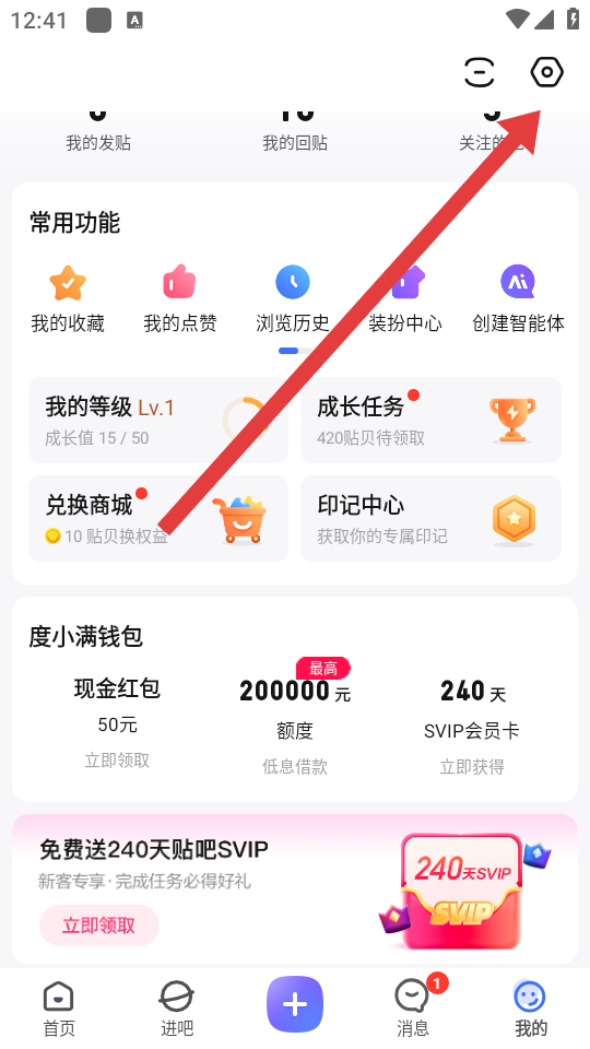 1、打開百度貼吧APP,進入底部導(dǎo)航欄最右側(cè)我的頁面,點擊頁面右上角的設(shè)置圖標,進入設(shè)置界面。