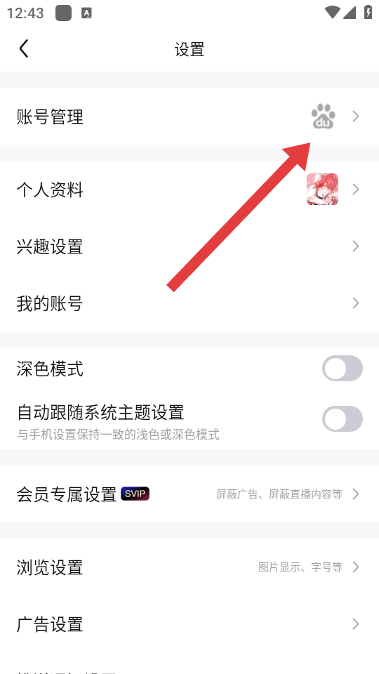 2、在設(shè)置界面中,找到并點擊賬號管理選項,右側(cè)帶有百度爪印的圖標,進入賬號管理的頁面。