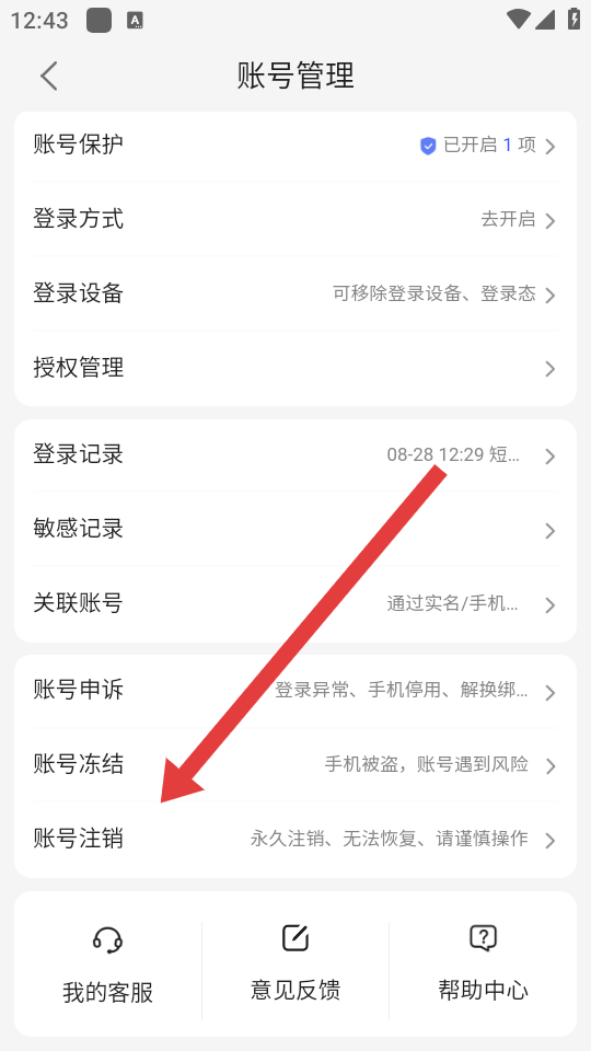 3、在賬號管理的頁面里,需要滑動查找并點擊賬號注銷選項,后續(xù)根據(jù)系統(tǒng)提示注銷賬號。