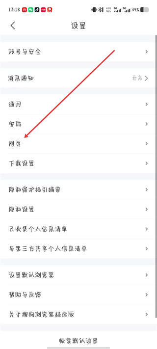 3、在設(shè)置頁面,找到列表中的點(diǎn)擊網(wǎng)頁。