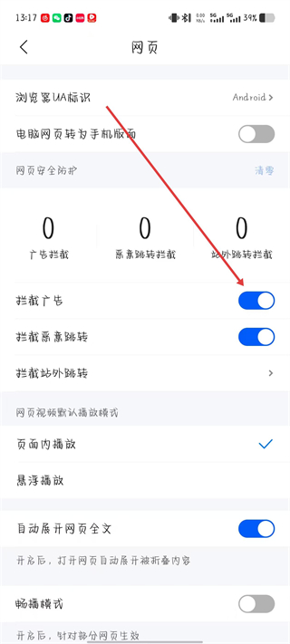4、找到攔截廣告選項(xiàng),將開關(guān)按鈕打開。