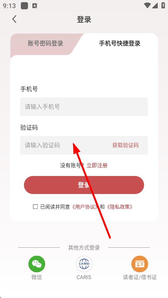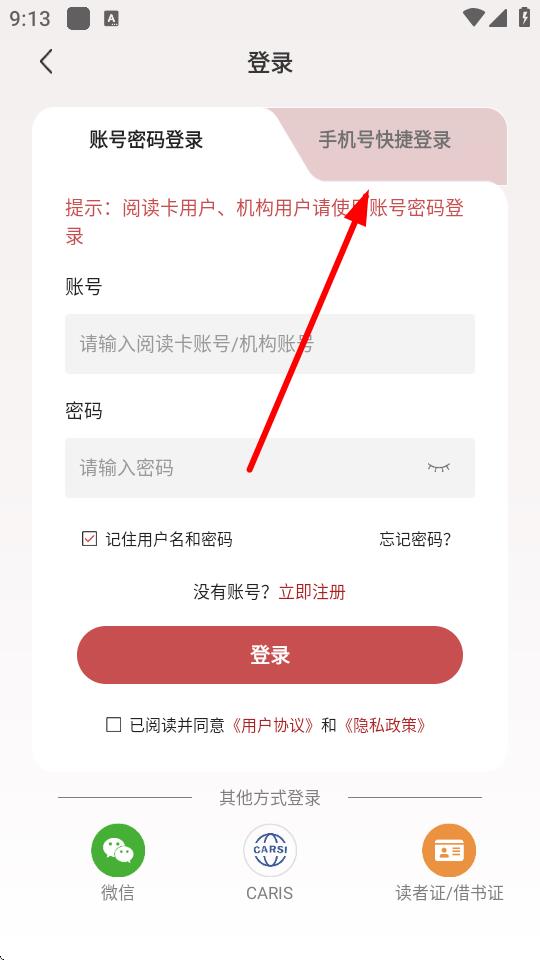 3、在登錄界面,若您有賬號,可選擇賬號密碼登錄,輸入閱讀卡賬號/機構(gòu)賬號和密碼后點擊登錄;也可以選擇手機號快捷登錄。
