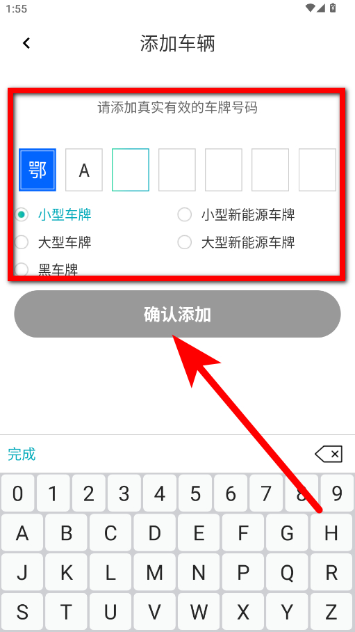 4、在添加車輛頁面,輸入真實有效的車牌號碼,并選擇車牌類型,點擊確認添加完成車輛添加操作。