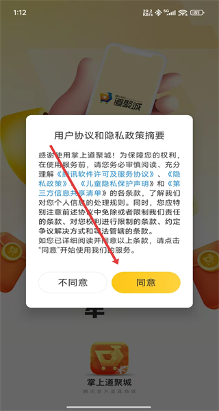 1、點(diǎn)擊“用戶協(xié)議和隱私政策摘要”彈窗的“同意”,進(jìn)入掌上道聚城登錄頁(yè)面。