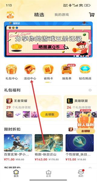 4、在進(jìn)入到應(yīng)用首頁(yè)后,可以點(diǎn)擊活動(dòng)中心按鈕,進(jìn)行查看活動(dòng)。