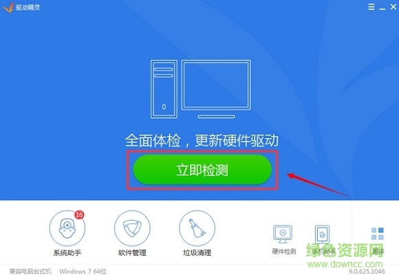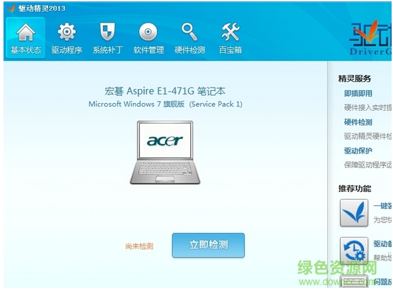 1.先在綠色資源網(wǎng)下載安裝驅(qū)動(dòng)精靈萬(wàn)能網(wǎng)卡版,然后雙擊打開(kāi)它。打開(kāi)之后我們可以利用驅(qū)動(dòng)精靈的智能檢測(cè)功能先對(duì)電腦進(jìn)行檢測(cè),這樣方便查看有哪些驅(qū)動(dòng)是可以更新的。那我們就點(diǎn)擊“立即檢測(cè)”按鈕然后等待電腦檢測(cè)就可以了,不過(guò)可能需要一段時(shí)間,每個(gè)人的電腦不一樣,可能會(huì)有所不同,耐心等待一會(huì)就好啦。