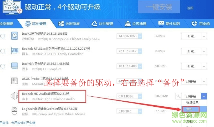 1.在更新驅(qū)動(dòng)之前一定要備份一下,避免更新之后驅(qū)動(dòng)不兼容無(wú)法使用的問(wèn)題。那驅(qū)動(dòng)精靈該備份該怎樣操作做,一起來(lái)跟小編來(lái)看看吧!在本站下載安裝驅(qū)動(dòng)精靈(萬(wàn)能網(wǎng)卡版),然后打開(kāi)運(yùn)行。我們要備份驅(qū)動(dòng),先將選項(xiàng)卡切換到”驅(qū)動(dòng)管理“,在這里我們可以看到所有驅(qū)動(dòng)列表,選中要備份的驅(qū)動(dòng),右擊選擇”備份“,如下圖所示: