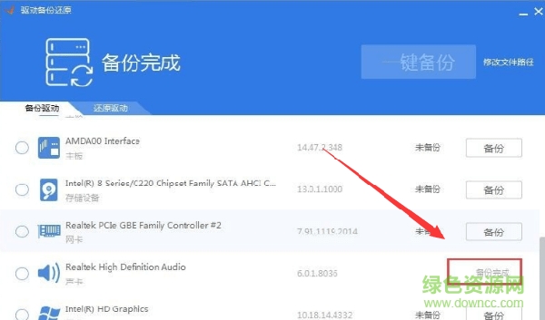 4.備份完成后,我們可以看到相對(duì)應(yīng)的驅(qū)動(dòng)后就顯示“備份完成”了,是不是很簡(jiǎn)單呢,有需要的小伙伴前來(lái)試試吧。(如果你發(fā)現(xiàn)升級(jí)的驅(qū)動(dòng)不兼容想還原驅(qū)動(dòng),還可以切換到“還原驅(qū)動(dòng)”選項(xiàng)選擇想要恢復(fù)的驅(qū)動(dòng),點(diǎn)擊一鍵還原就可以了,操作非常簡(jiǎn)單。)
