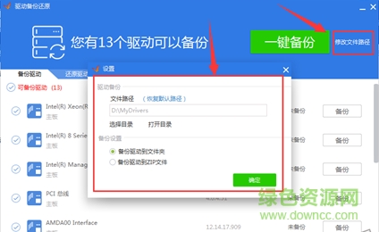 3.當(dāng)然你也可以選擇需要備份的硬盤路徑,點(diǎn)擊“一鍵備份”旁邊的“修改文件路徑”選項(xiàng),點(diǎn)擊后會(huì)彈出一個(gè)路徑選擇框,大家可在這里設(shè)置要備份驅(qū)動(dòng)的路徑,編輯完成點(diǎn)擊確定就可以了。