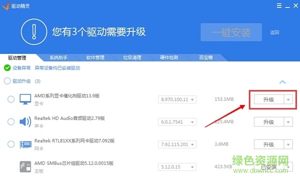 3.點(diǎn)擊打開(kāi)后,在這里我們就會(huì)看到驅(qū)動(dòng)精靈智能檢測(cè)可升級(jí)的驅(qū)動(dòng)詳細(xì)列表了,點(diǎn)擊被檢測(cè)到需要更新的硬件驅(qū)動(dòng),在彈出的對(duì)話框中選擇“升級(jí)更新”,然后即會(huì)自動(dòng)下載更新;下載完成以后,會(huì)彈出安裝對(duì)話框,接著我們只需要根據(jù)驅(qū)動(dòng)精靈萬(wàn)能網(wǎng)卡版系統(tǒng)的提示一直點(diǎn)擊下一步即可,最后點(diǎn)擊完成,這樣驅(qū)動(dòng)就更新完畢了。如果想檢測(cè)自己的驅(qū)動(dòng)是否升級(jí)成功,可返回驅(qū)動(dòng)精靈萬(wàn)能網(wǎng)卡版主界面,重新進(jìn)行體檢,這時(shí)看到暫無(wú)可升級(jí)驅(qū)動(dòng),這就說(shuō)明我們升級(jí)驅(qū)動(dòng)成功了。(注意:驅(qū)動(dòng)程序升級(jí)后,需要重啟電腦)