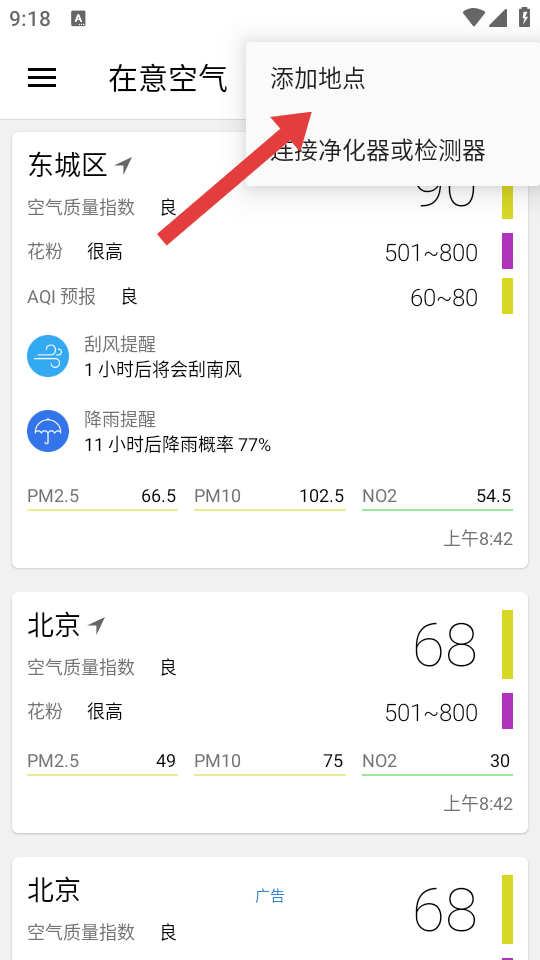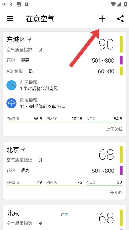 1、打開在意空氣APP,點擊主界面右上角的+號按鈕,彈出功能選項。