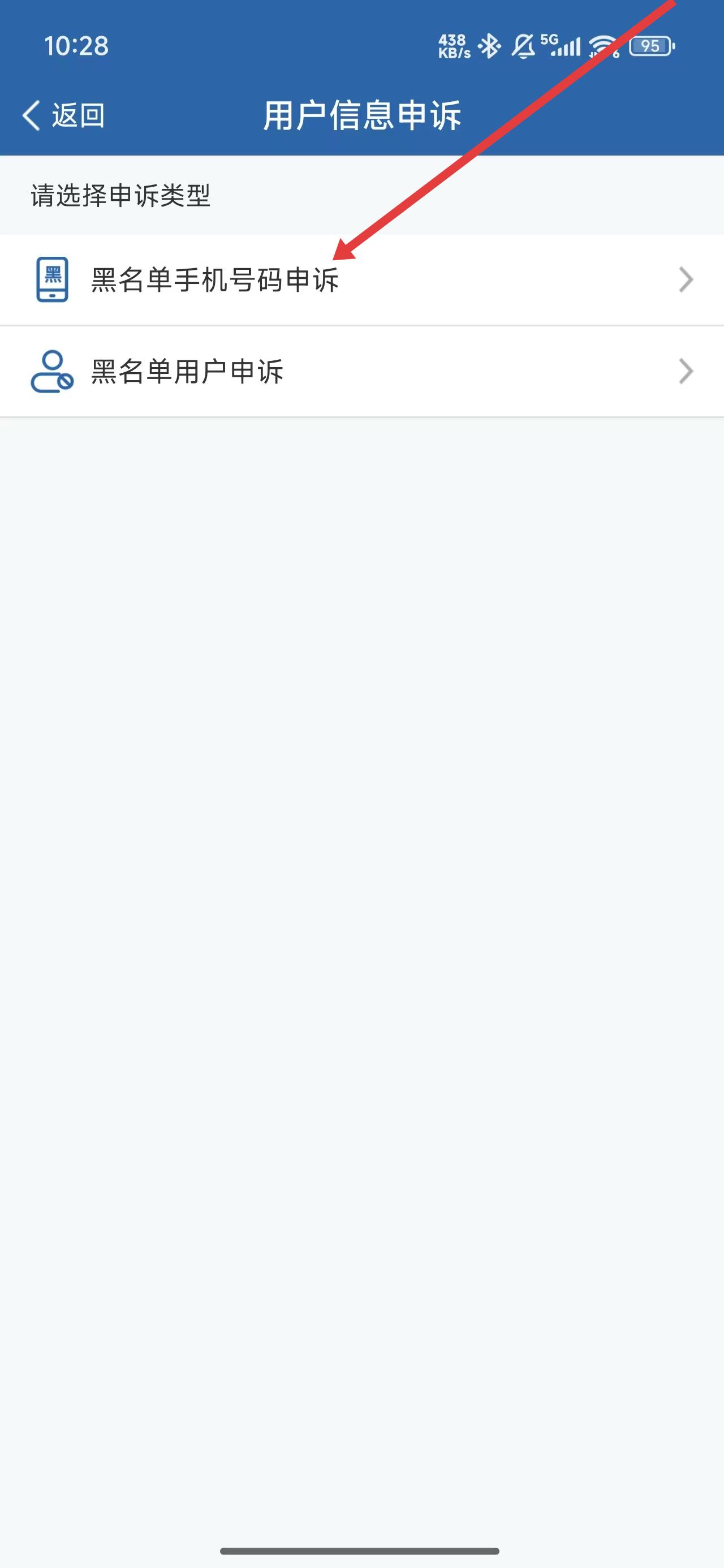4、在用戶信息申訴頁面中,可以點(diǎn)擊黑名單手機(jī)號(hào)碼申訴選項(xiàng),使用該申訴方式。