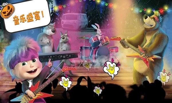 瑪莎與熊之 萬圣節(jié)搖滾音樂派對(duì)!創(chuàng)建自己的音樂樂隊(duì)!成為超級(jí)巨星!來加入瑪莎和動(dòng)物們的樂隊(duì),瑪莎和熊是吉他手,狼在彈鋼琴,兔子是鼓手,還有其他小伙伴們,快來加入!