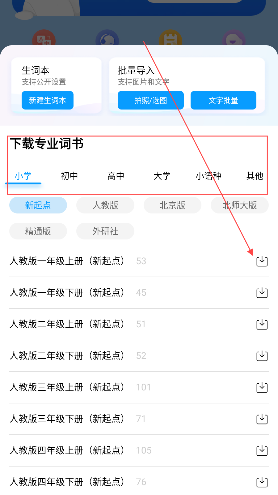 2、在背單詞界面的詞句收藏板塊,點擊+號,進入下載專業(yè)詞書頁面,按照小學、初中、高中等分類,選擇需要的詞書,點擊詞書右側下載按鈕進行下載。