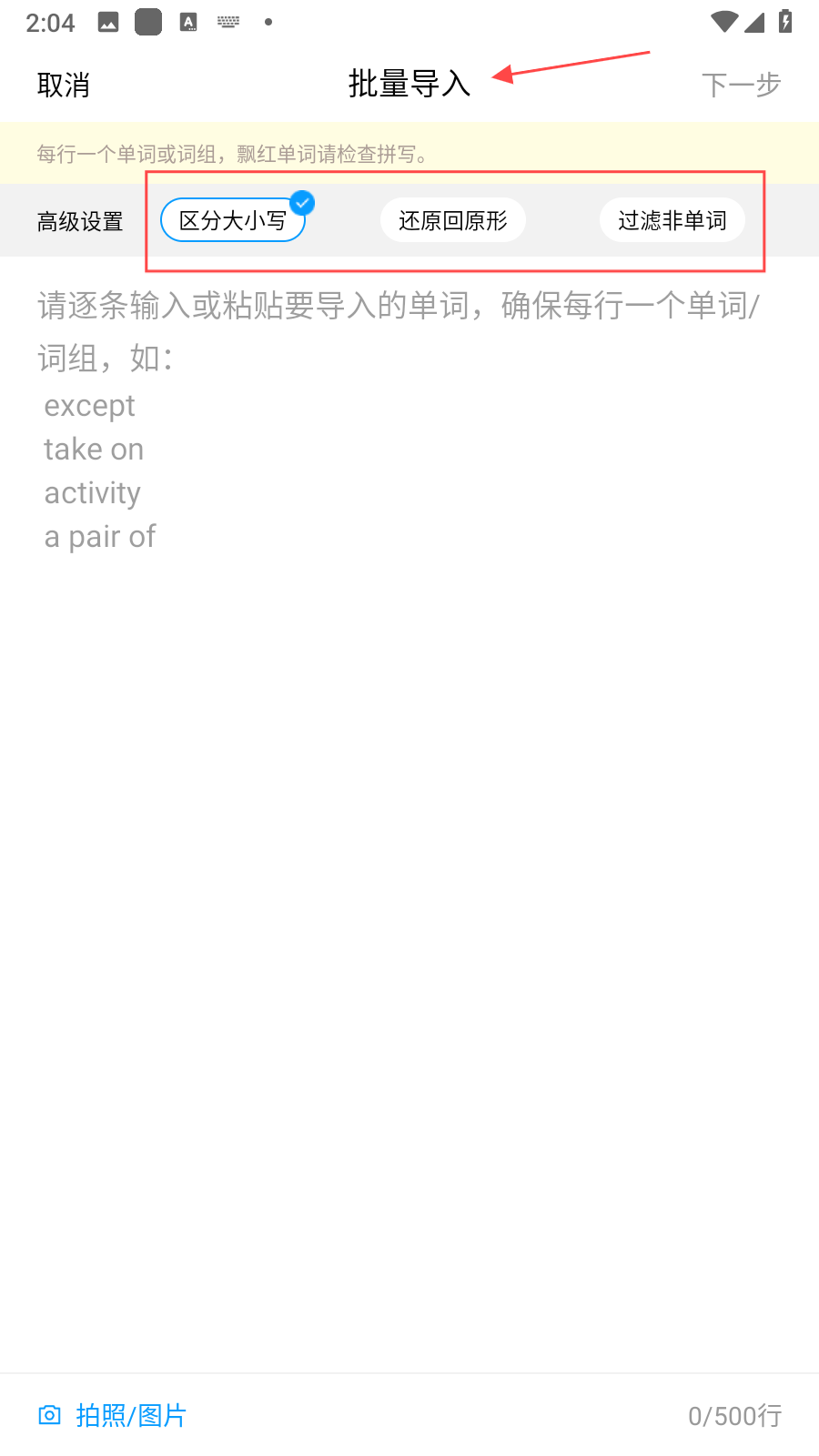 3、若需導入個性化單詞,在詞句收藏點擊+號后,選擇文字批量進入批量導入頁面,在高級設置中按需選擇區(qū)分大小寫,還原回原形等選項,然后輸入或粘貼要導入的單詞。