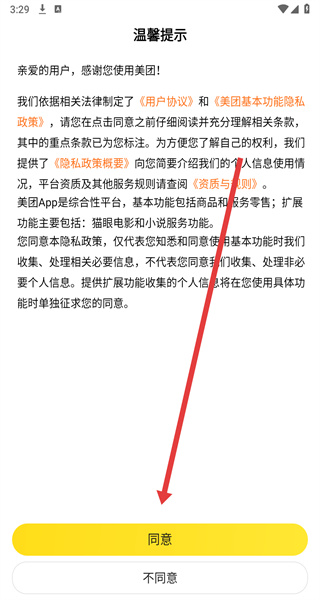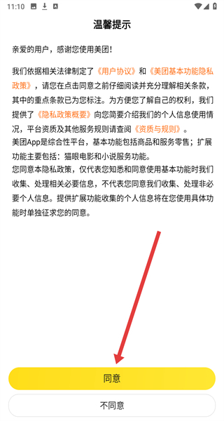 1、點(diǎn)擊“溫馨提示”的“同意”,進(jìn)入美團(tuán)主界面。
