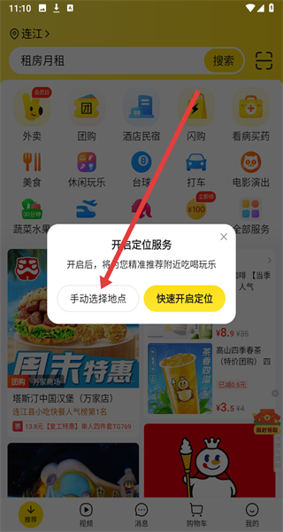 2、在進(jìn)入到App中,可以在開啟定位服務(wù)彈窗中,點(diǎn)擊手動選擇地點(diǎn)進(jìn)行定位操作。