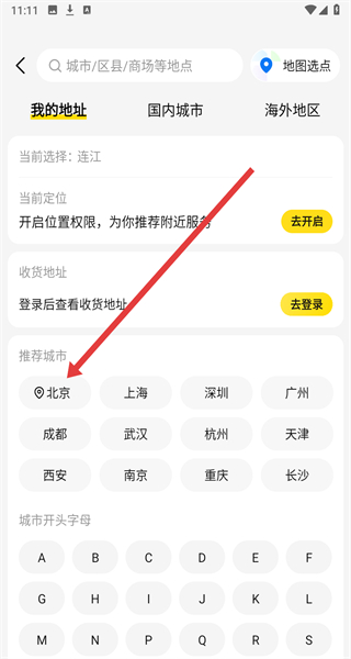 3、在進(jìn)入到現(xiàn)在地址頁面中,可以點(diǎn)擊選擇北京定位到該城市。